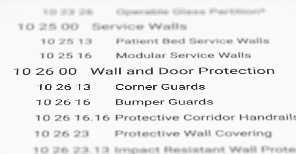 The MasterFormat corner guard spec section is 10 26 13. That is inside 10 26 00 Wall and Door Protection and Division 10 - Specialities. If you need Commercial Corner Guard specification information for your project you can chat with us by clicking on the chat icon in the bottom right of the screen or contact us at projects@commercialcornerguards.com.